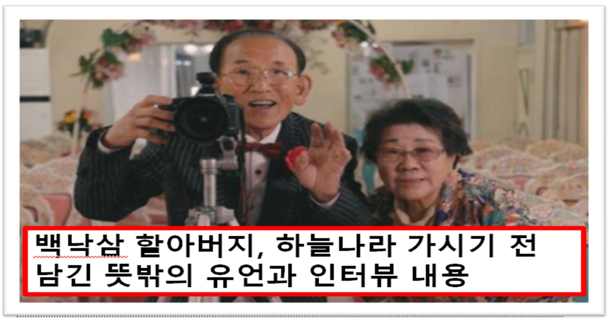백낙삼할아버지는 작년 4월 과로로 쓰러져 병원에서 뇌출혈 판정을 받고 약 1년간 투병생활을 끝으로 영면하였습니다. 투병생활 중 뜻밖의 유언과 인터뷰를 남겼다고 하는데..